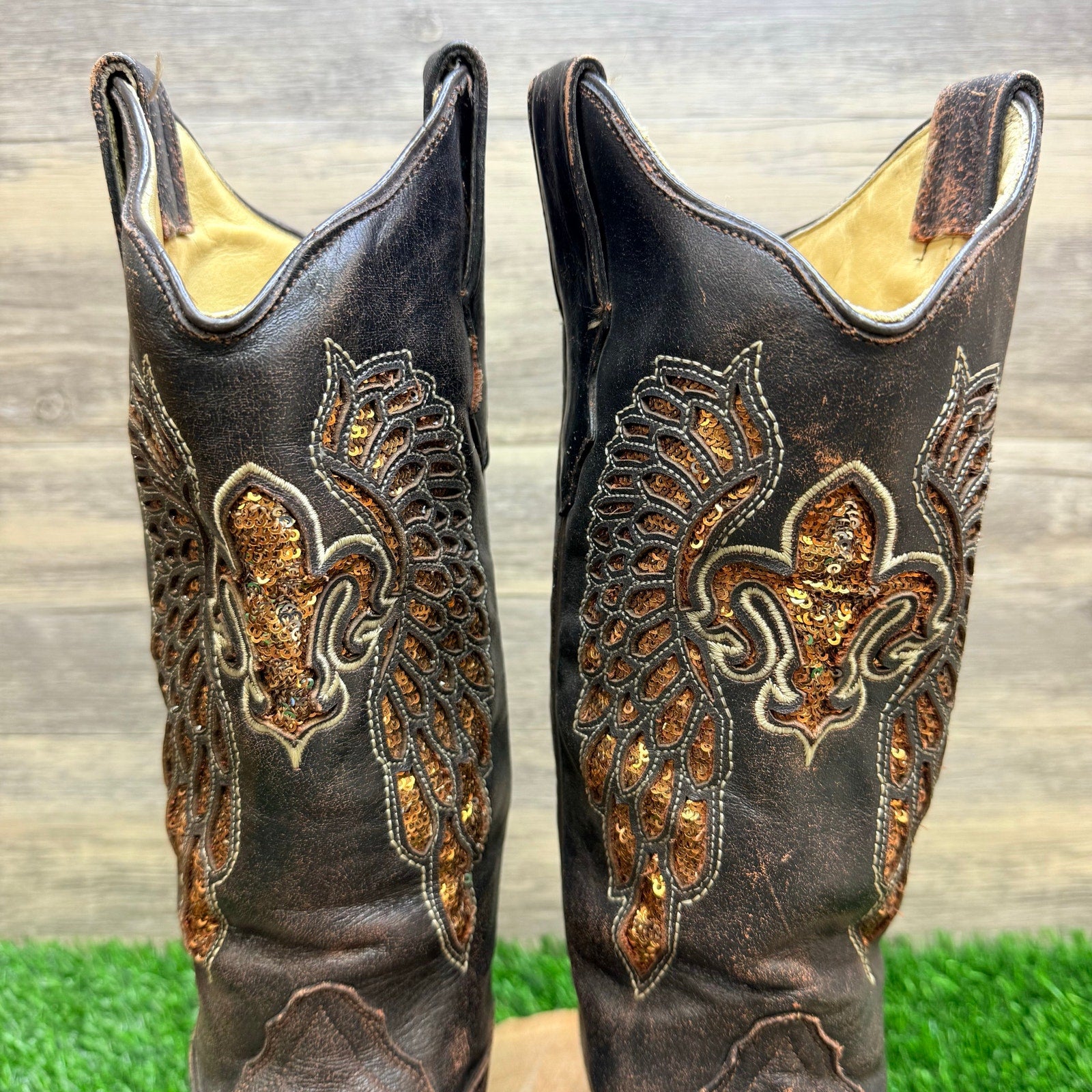 Corral Women - Size 7M - Brown Fleur De Lis Wings Cowboy Boots R2549