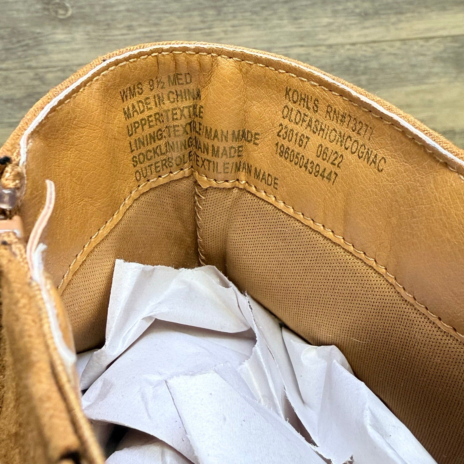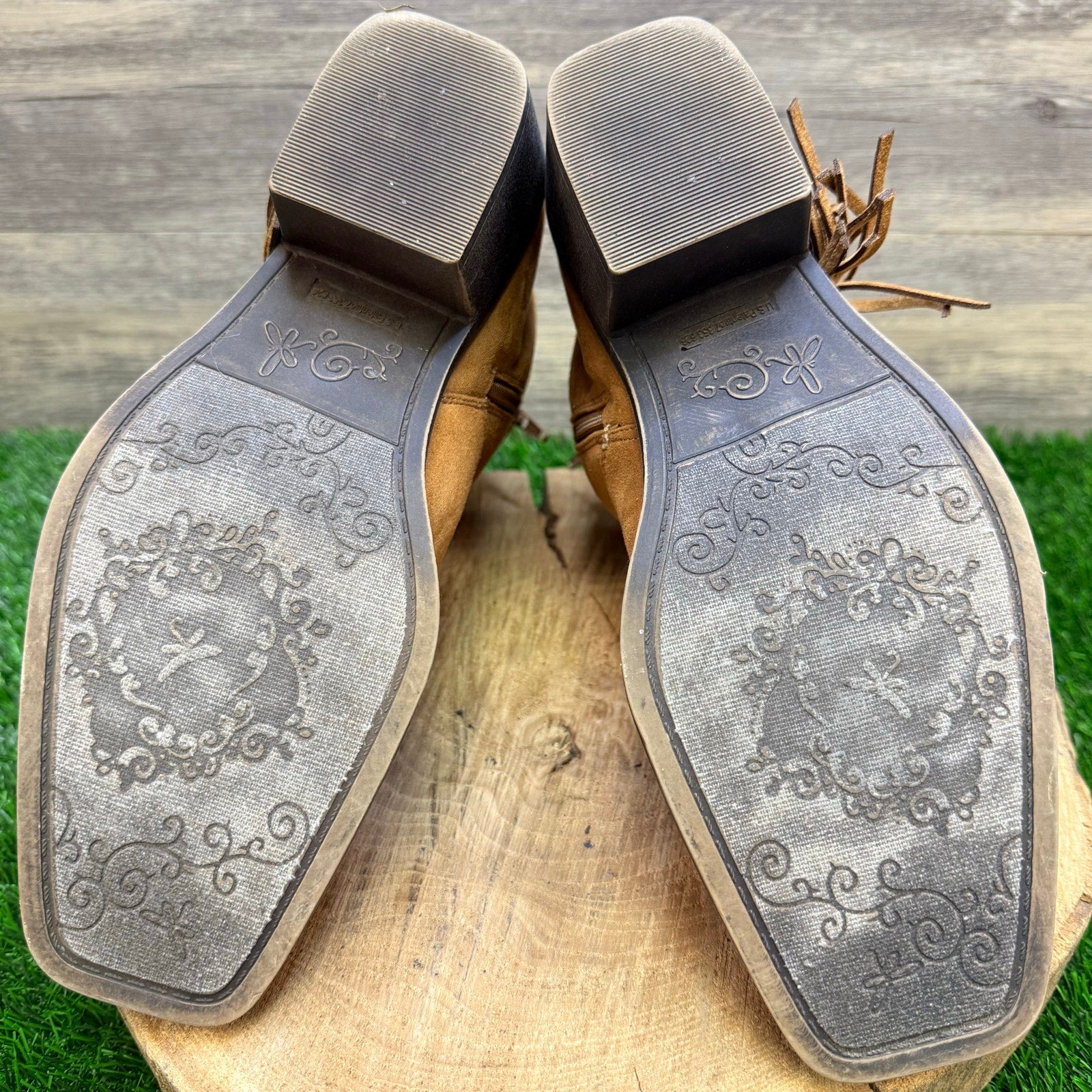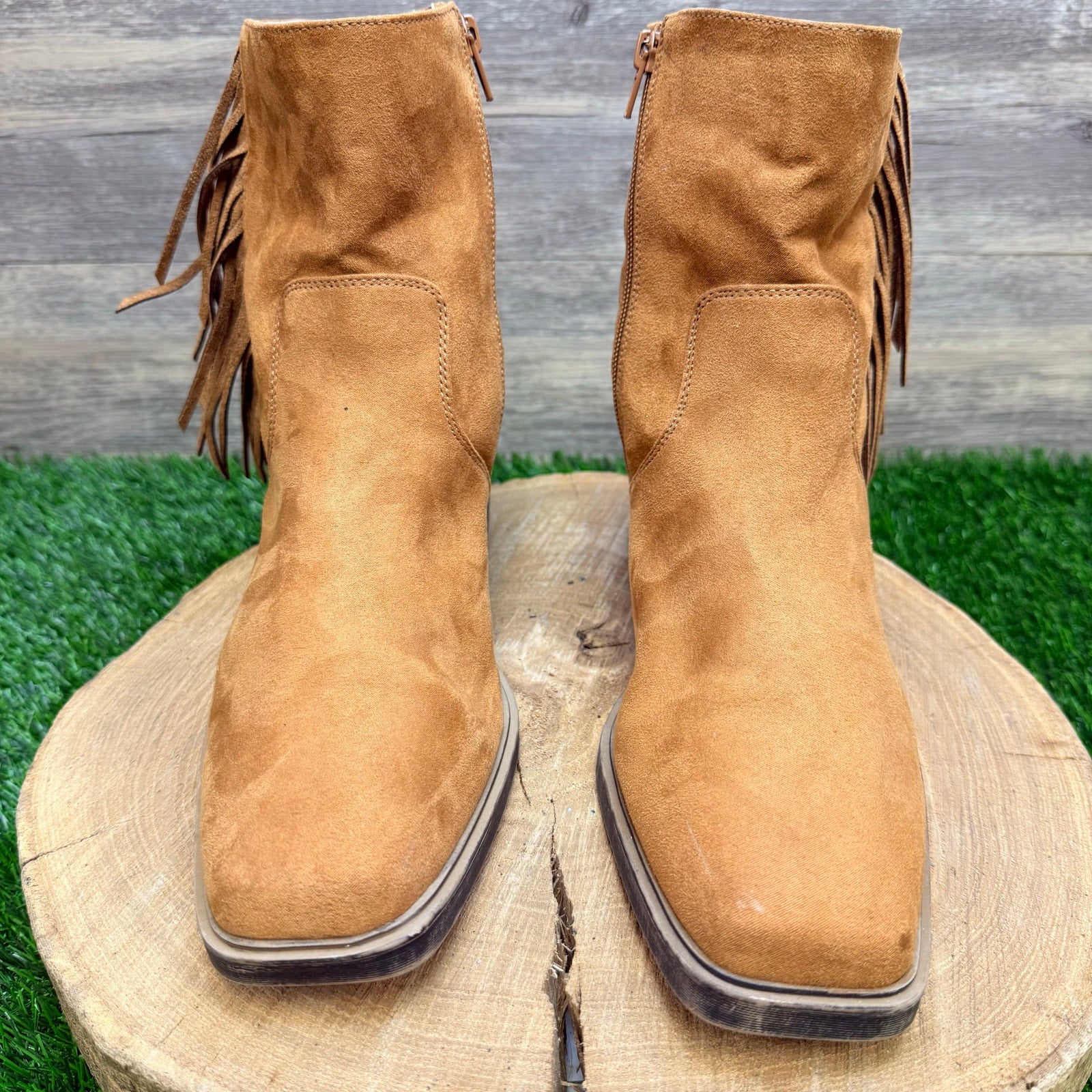 OS Women - Size 9.5M - Cognac Faux Suede Fringe Ankle Boots 73277
